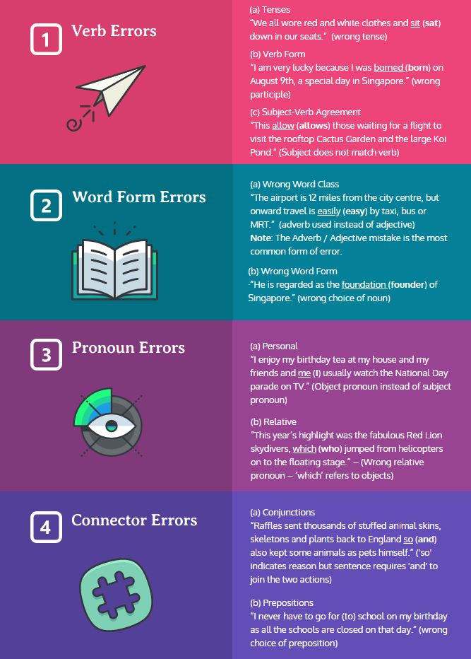 Issues with verbs, or action words, are the most common errors in the Editing section of the ‘O’ level paper.